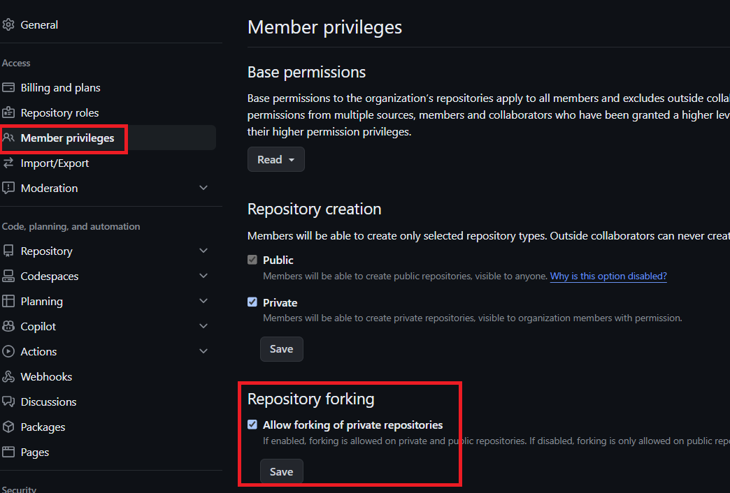 2. Member privileges에서 Repository forking에 체크한 후 save 합니다.